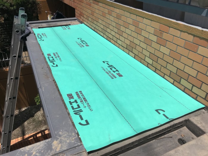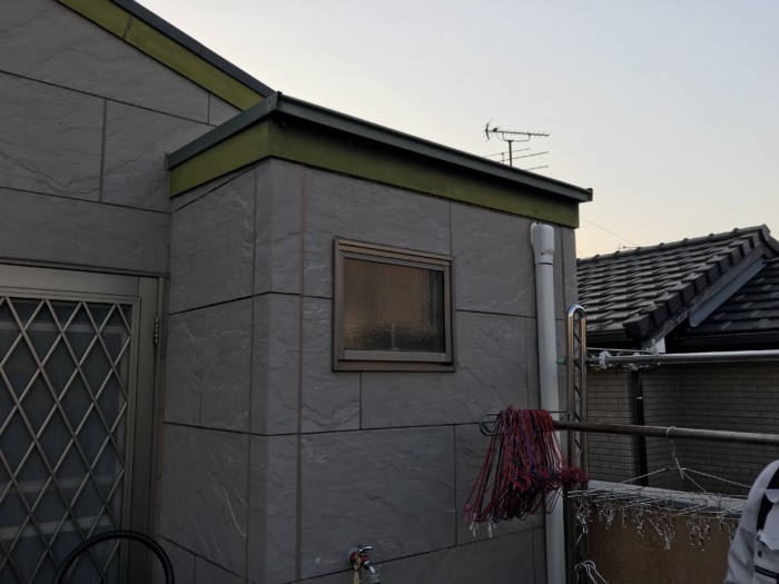 加工樋などに使う事が多い皮膜付きの板金をかぶせました。そしてコーキング剤で処理をして終了です