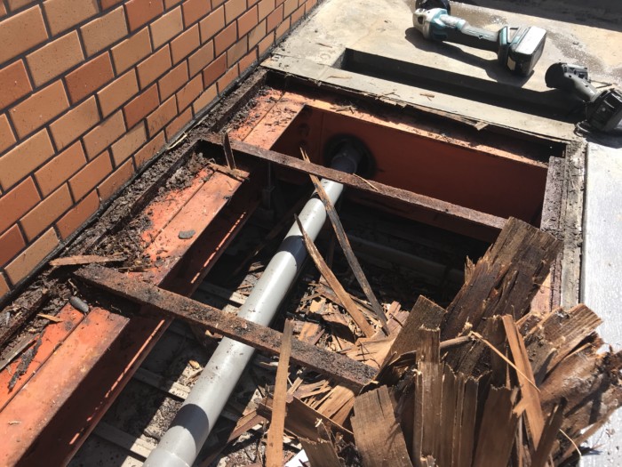 屋根は勾配が無いのでこの屋根材では対応しきれていませんでした、下地も腐ってしまっていました。築15年程なので壁のシーリングも切れている所が多々ありますが、今回はとりあえず雨漏れ修理という事で部分的に板金で囲いました。