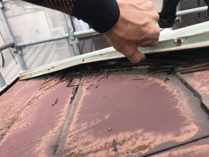 棟板金の木下地もぼろぼろで棟板金も色あせてしまっていました。