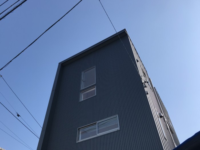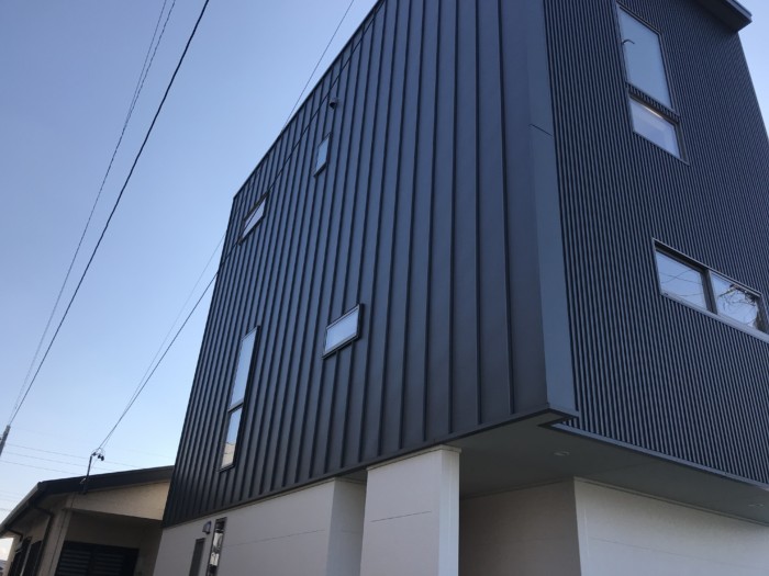 横面は屋根材に使われる立平を施工させて頂きました。こちらも屋根材に使用する事もあってビスが隠れていくタイプの材料です。